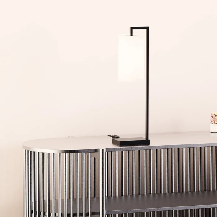 This table lamp is a modern classic, boasting a clean-lined rectangular frame that supports a cylindrical fabric shade. This lamp’s design is compatible with e26 bulbs, offering versatility and warmth to any lighting scheme. Its straightforward geometric form pairs beautifully with the soft texture of the shade, making it an ideal lighting solution for contemporary spaces seeking a blend of simplicity and elegance.