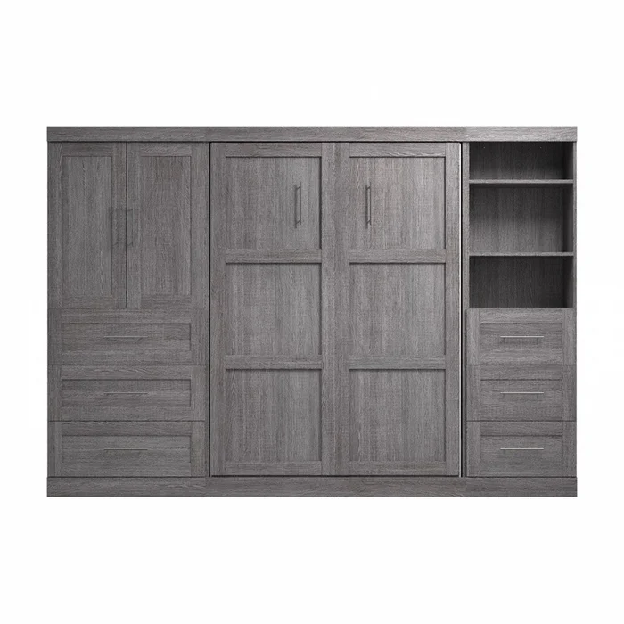 The Bestar Pur Full Murphy Bed with Open and Concealed Storage (120W) is the ideal space saver for a multipurpose room. The Murphy Beds shaker-style design adds a touch of transitional styling to any room. This bundle offers plenty of storage options. Hang your clothes in the storage cabinet, store items in the drawers, and display books and decorations on the shelves. You can choose your own mattress since the bed accommodates most standard Full mattresses and supports up to 1000 lb (including mattress). The mattress support uses flexible slats that follow the curves of the body and absorb pressure for maximum comfort. The open bed extends 84. 9 inches from the wall. The cabinet must be anchored to a wall with a minimum ceiling height of 86. 4 inches. Allow a clearance of 30-36 inches around the open bed. The dual-mount wall bed mechanism attaches to the floor and wall for maximum stability and durability. To avoid risk of injury, the bed must be installed to wall and floor structure by a professional or qualified person. Two people are required for assembly. Installation requires attachment to wood studs or masonry, removal of the baseboard, and drilling into the floor (if disassembly is required, holes may be covered with baseboards 0. 5 inches or thicker). All necessary hardware is included. Do not use this product for children or pets under 50 pounds (22. 7 kg). Backed by the Bestar 10 Year Manufacturers Warranty. North American made with globally sourced materials.