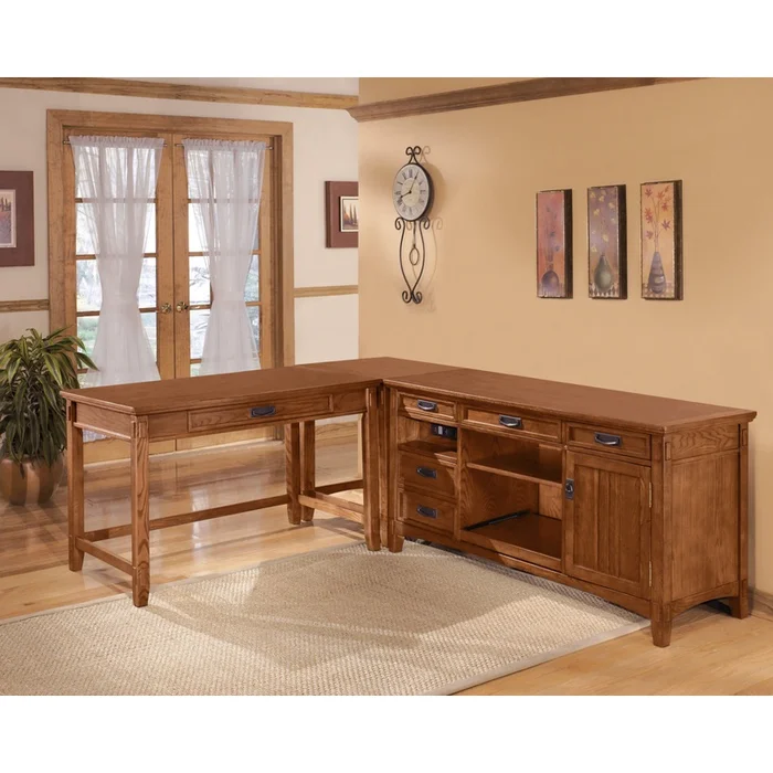 Make your way towards the perfect office setup with this Carson three-piece desk package. Finished in gorgeous oak veneers, this L-shaped setup provides all the room you need to tackle your office to-do list. A variety of drawers, trays and cubby shelves offer storage galore, while the desk and corner table ensure you have enough desktop space to spread out your reports. Finally, the hardwood construction and warm colour create a classic style that would look equally at home in a rustic lodge as in a country cottage.