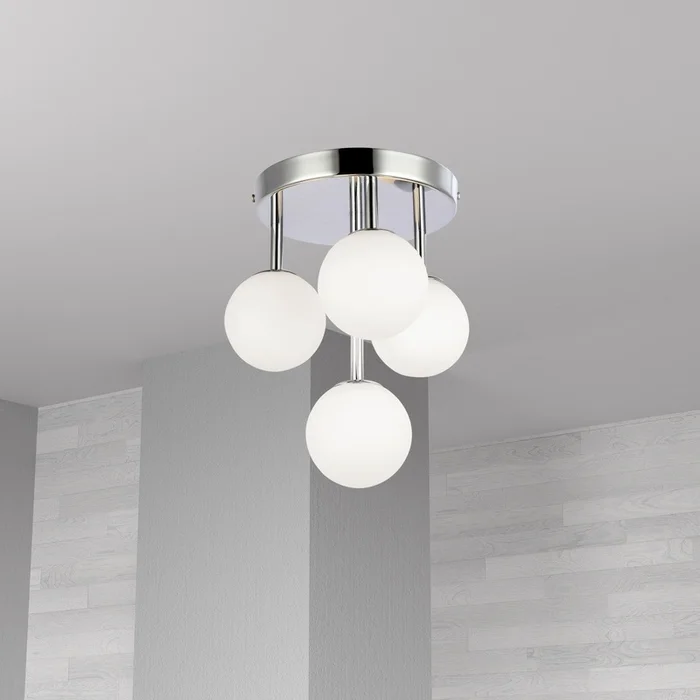 Dainolite Megallan 4 Light Flush Mount Polished Chrome Opal White Glass Lamp|Plafonnier affleur Megallan de Dainolite en verre blanc opale, avec fini chrom poli et 4ampoules