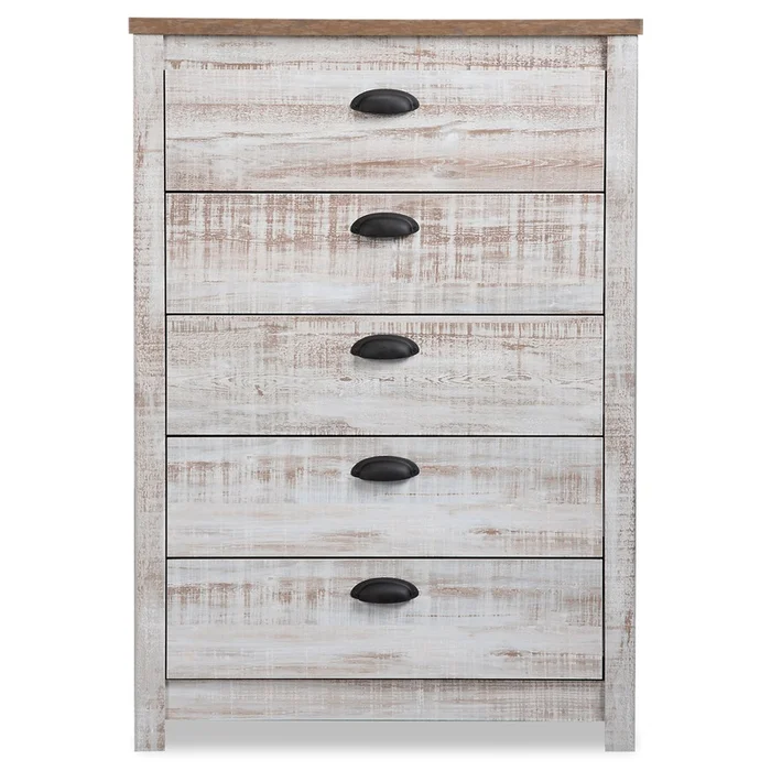 Bring a touch of farmhouse living to your bedroom with this Kaia chest. A laminate finish features a beautiful distressed whitewashed look that gives off a warm feeling of tranquility. Contrasting black metal drawer pulls allow you to easily store your clothing, extra blankets or any other bedroom essentials. The resilient engineered wood frame is resistant to splits and cracks, and ready to keep all your precious treasures safely protected. Whether you live in the middle of a busy city or out surrounded by nature, with the Kaia any home can be your own private country getaway.