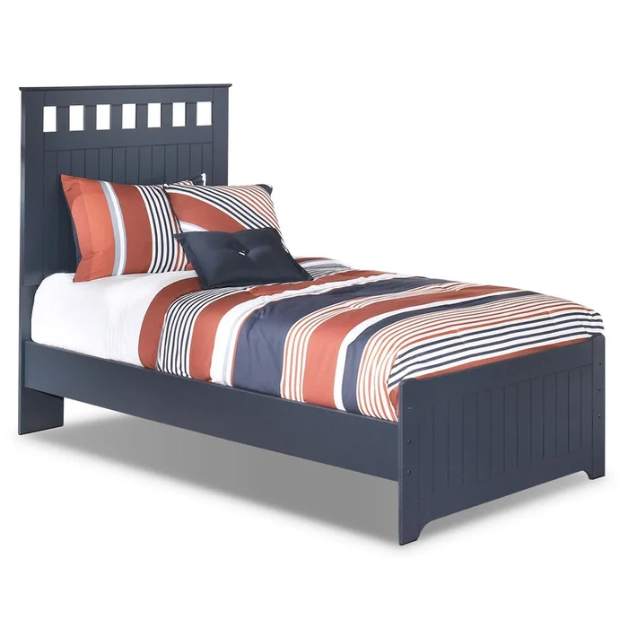 Add charm to your home with the Leo 5-piece full panel bedroom package. Tinted in a replicated blue paint finish, this matching set provides not only the perfect place to sleep, but also many great options for tucking away clean clothes and socks. The combination of grooved side panels, beaded rectangular frames and brushed nickel hardware create a timeless design that makes every morning feel a little bit more light and airy. Kids grow up fast, so leave them with bedtime memories that last.