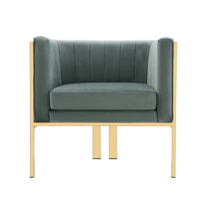Lounge in 1920s luxury. This sophisticated accent chair is a modern, assertive take on the classic Art Deco style. An open architectural frame in polished brass wraps around the plush velvet seat, creating an inviting combination of simplicity and luxury. The seats backrest is accented with vertical stitching to complement it’s geometric frame. The symmetrical, streamlined look will add an evocative touch of distinguished 20s glamour to any space.