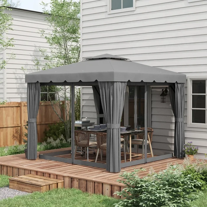 Imagine yourself relaxing outside in the beautiful summer weather. Sun is shining, a drink is in your cup. Wait, that sun though, it’s really warm… next thing you know it’s far too hot and you’re back inside. That is, of course, unless you find yourself in the protective cover of an Outsunny outdoor 10′ x 10′ patio gazebo. It’s just you, your friends and family, this patio gazebo, and some fine times spent enjoying the great outdoors in your own personal oasis.