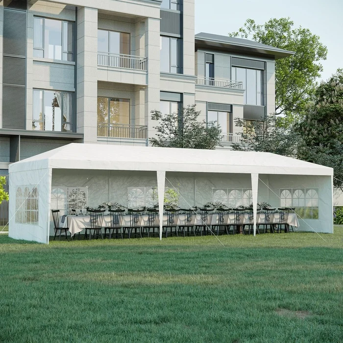 This new 9. 4′ x 27. 9′ outdoor canopy tent is a great outdoor shelter. It is ideal for car tent, family party, picnics, sport events, outdoor vendors, camping trip and more. Rust free steel construction with quality polyethylene canopy, this backyard tent is more durable. Besides, pull ropes and ground stakes are included for added stability, easy to set up and take down.