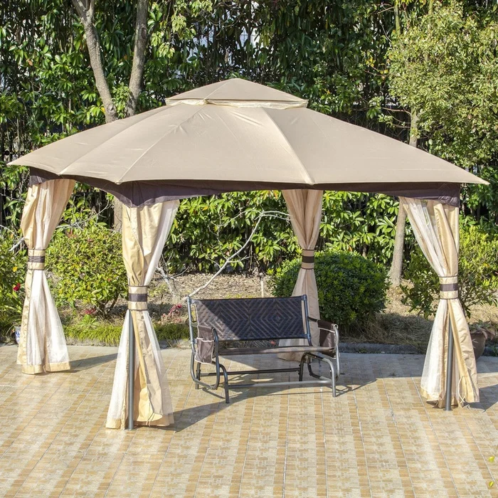 This double roof soft gazebo from outsunny is your best choice to relax and enjoy parties. The polyester canopy, netting sidewalls, side curtains and steady steel frame create a comfortable space for you to enjoy your time. Its suitable sizing provides enough shelter for yourself and several other people. You can set up this gazebo in the garden, have a nice gathering with friends or family. Let this practical outdoor gazebo to improve your happiness and life quality.