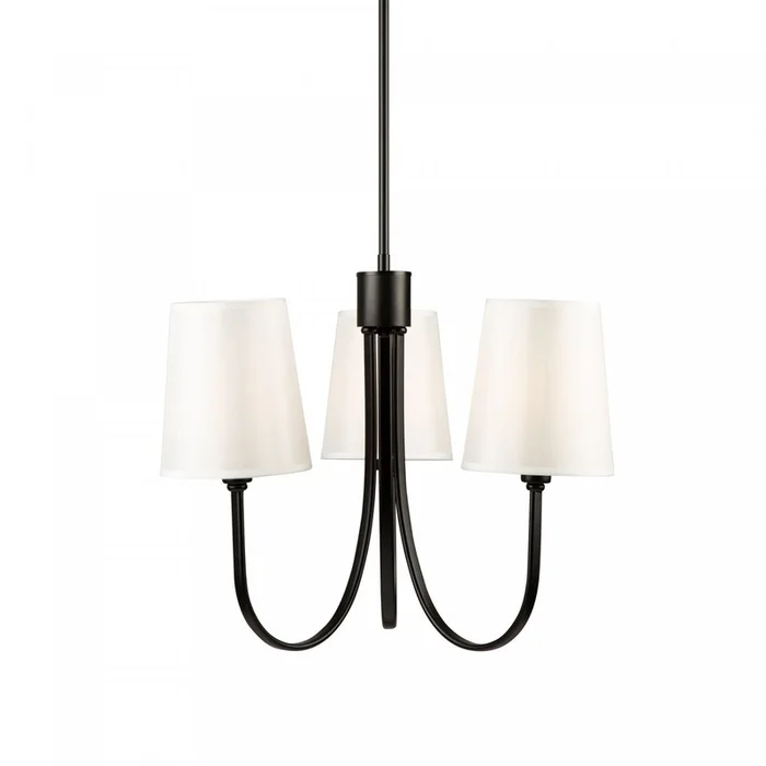 From the S&C design firm, with strict direction from Steven Sabados, the Rhythm Collection chandelier features a traditional type frame with flat tubular arms. The frame is finished in matte black and complimented with linen hardback white shades.