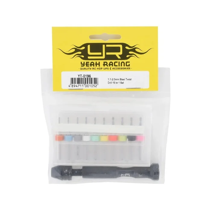 This is a Yeah Racing Steel Twist Drill Set, a precision hand drill set-up with ten bits, a black anodized aluminum hand drill and a convenient carrying case. The steel bit have been color coded to speed up repair time and keep organized. This set includes ten pieces, increasing in 0.1mm increments ranging from 1.1 to 2mm.
