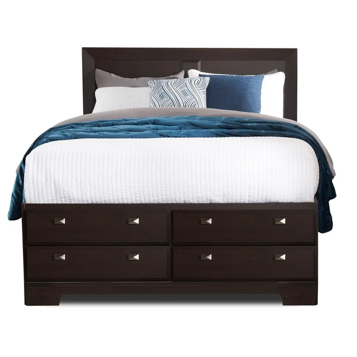 Embrace the feeling of contemporary style with the Yorkdale full storage bed. A deep brown finish made from engineered wood creates a neutral base to pair perfectly with almost any room decor. A sleek, tall headboard features a simple two-panel design that lets the dark saddle birch finish colour shine through. Built into the lower half of the bed are a dozen drawers to help you keep extra blankets or pyjamas close at hand. Let the sleek, modern design of the Yorkdale bed help you build the perfect space for rest and relaxation.