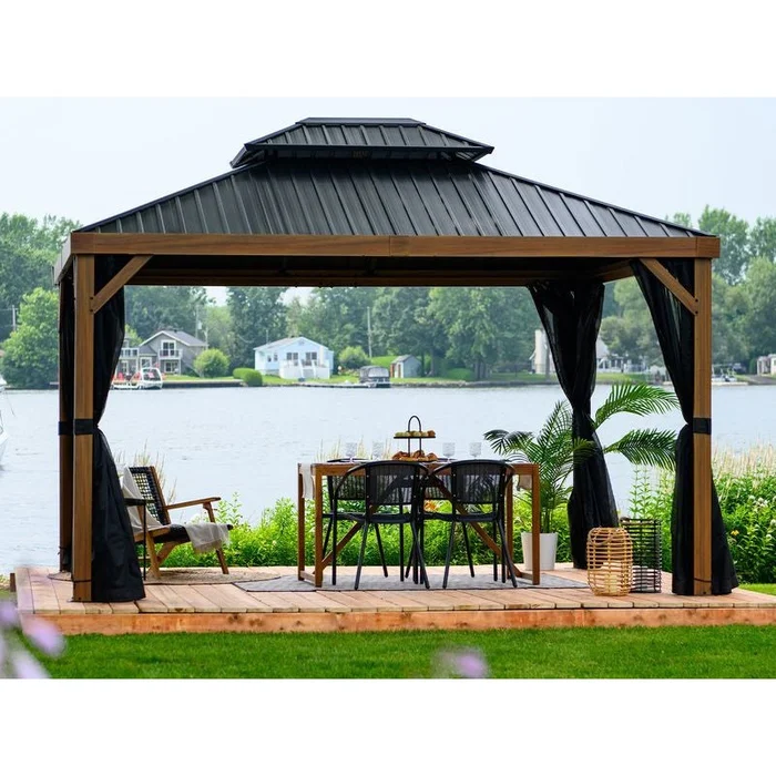 crafted with a sturdy aluminum frame, this gazebo boasts exceptional durability and resistance to the elements. Our reinforced roof is made of 0. 45 mm galvanized steel and is uv protected. The wood powder coated finish adds a touch of natural warmth, making it a perfect fusion of strength and style. Rest assured, this gazebo is built to withstand the test of time. Double roof benefits: